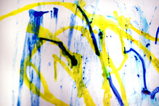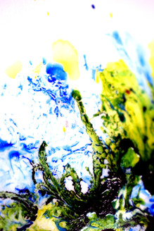 One technique I was keen to explore was the use of PVA and ink. I covered the page in wet glue, before applying the ink in different ways, allowing the too materials to react together and create different textures and patterns. Once the ink was on the paper I tried using a range of techniques to achieve individual outcomes. These included the application of heat using a hair dryer, scraping the ink, blowing the ink through a straw and allowing the ink to sit where it dropped onto the paper. I liked the way the ink created cell-like entities on the paper, the marks looked almost like magnified bacteria. Although ink does this when dropped into water, the way it reacted with the glue was different. The ink was restrained by the thickness of the material which meant the ink cracked and made the marks more interesting. This method showed the layers of colour present in the ink.