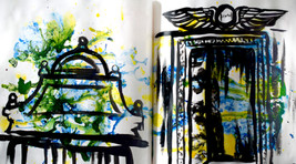 Once I had decided that I wanted to make sculptural work, I had to think about how I wanted to create the pieces. Previously I had applied my background colours to the top of the piece, in an area devoid of any architectural structures, only allowing the ink to drip slightly into the image. This wasn't going to work as that part would be cut away and kept for other uses, the drawings would then be mostly devoid of colour and I didn't want that to happen.